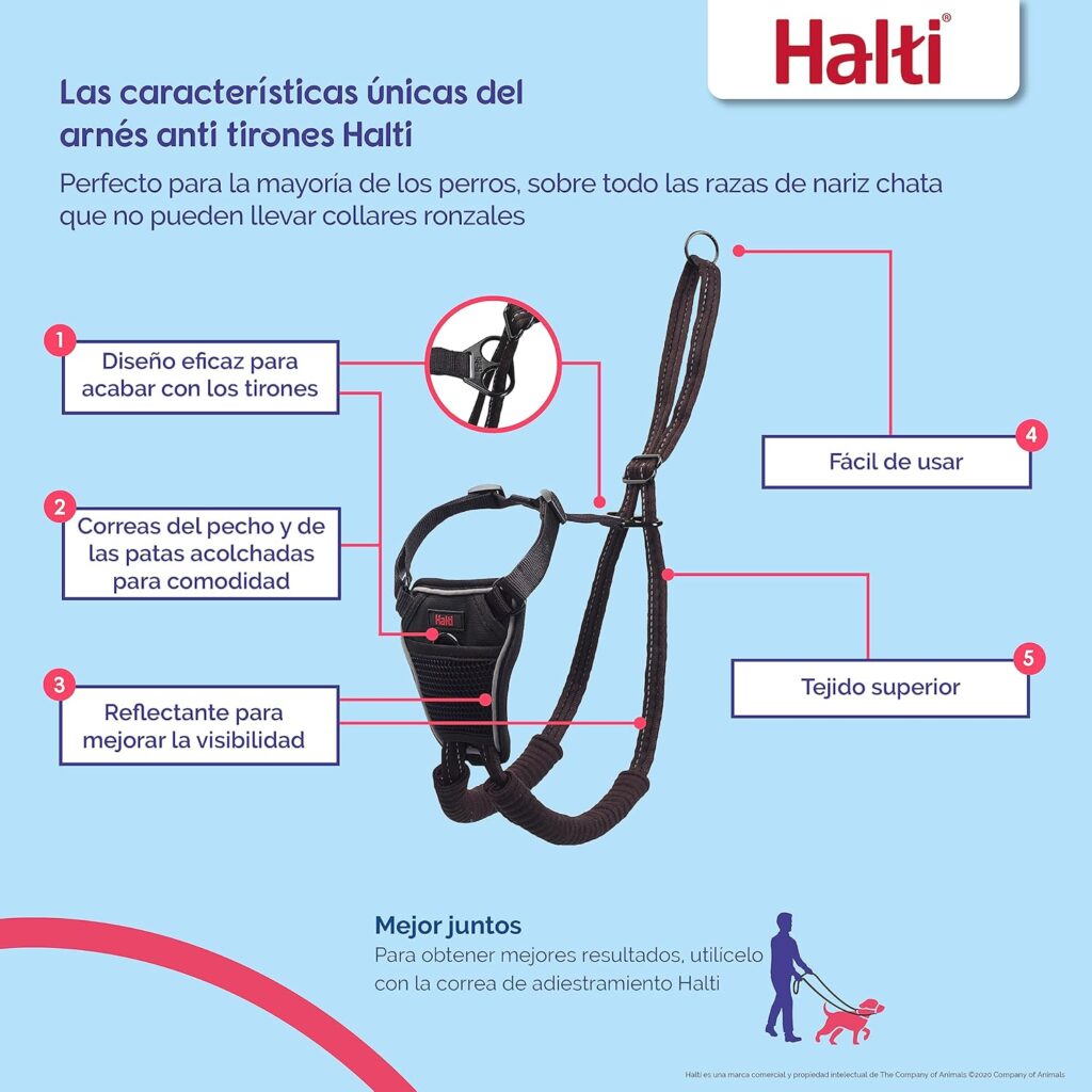 Uno de los modelos más conocidos y utilizados es el arnés antitirones HALTI, diseñado específicamente para ayudar a corregir este comportamiento sin causar daño.